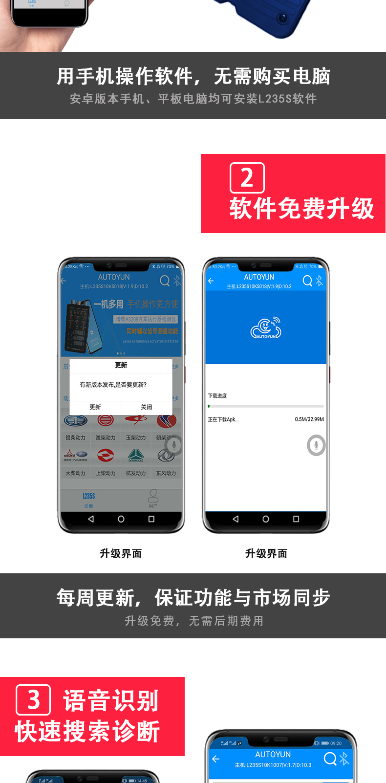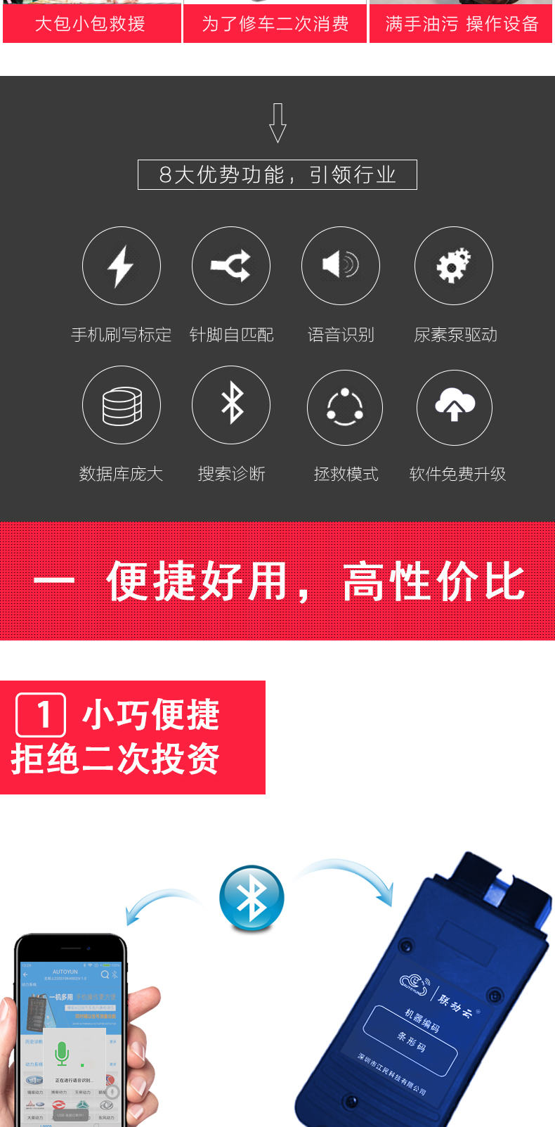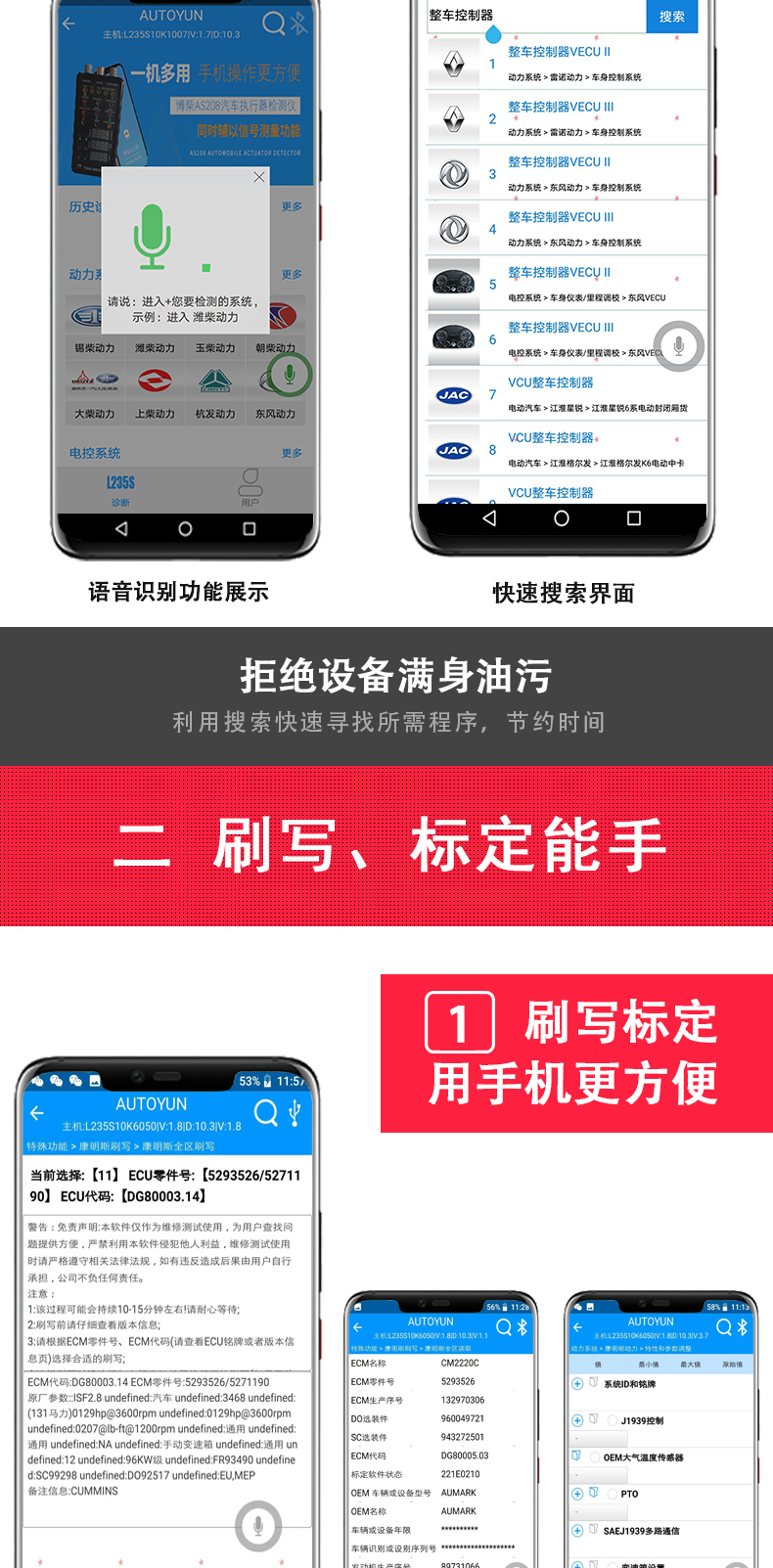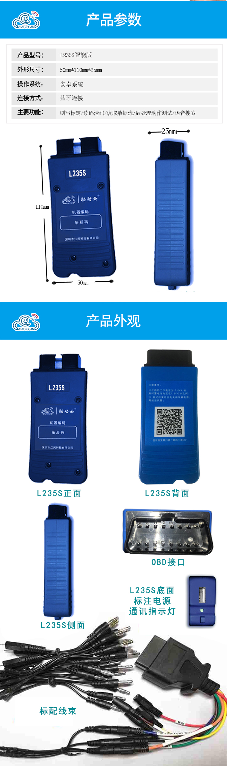 聯(lián)動(dòng)云L235S智能語(yǔ)音版手機(jī)診斷儀開創(chuàng)商用車診斷便捷化,一個(gè)插頭足可以診斷幾乎市面上包含工程車輛,卡客車,大中小柴油系列發(fā)動(dòng)機(jī),修車隨時(shí)隨地?zé)o懼刮風(fēng)下雨,無(wú)懼天冷手凍,無(wú)懼電腦沒電,一個(gè)診斷設(shè)備可以同時(shí)安裝五部手機(jī)使用,具備故障診斷,標(biāo)定刷寫,是維修技師外出應(yīng)急救援必備神器,同時(shí)也是維修門店必備的第二臺(tái)診斷設(shè)備,解放雙手語(yǔ)音喚醒進(jìn)系統(tǒng),簡(jiǎn)單快捷,方便高效。